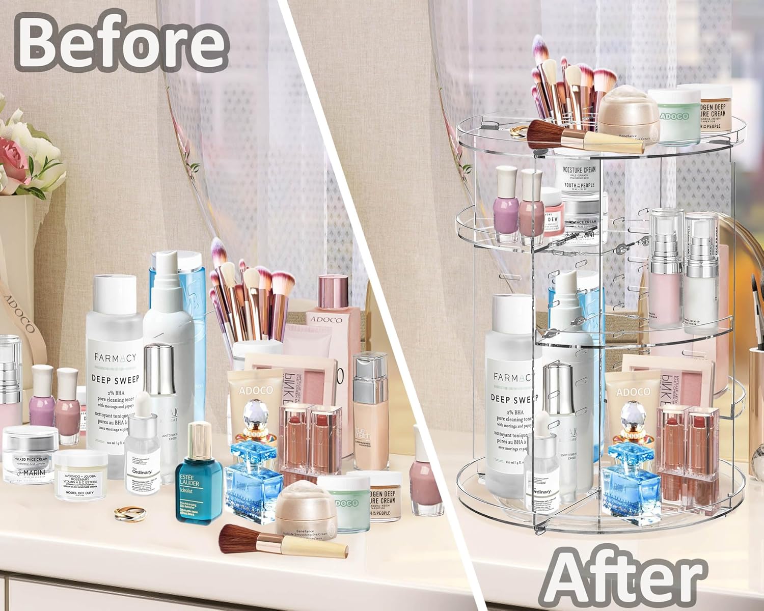 • 360 DEGREE ROTATING ORGANIZER: With its steady rotating base, the cosmetic storage can be easily rotated and ultra-quiet when it’s rotated, which makes it easy to get what you want and put them back quickly, saving most of your searching time.
